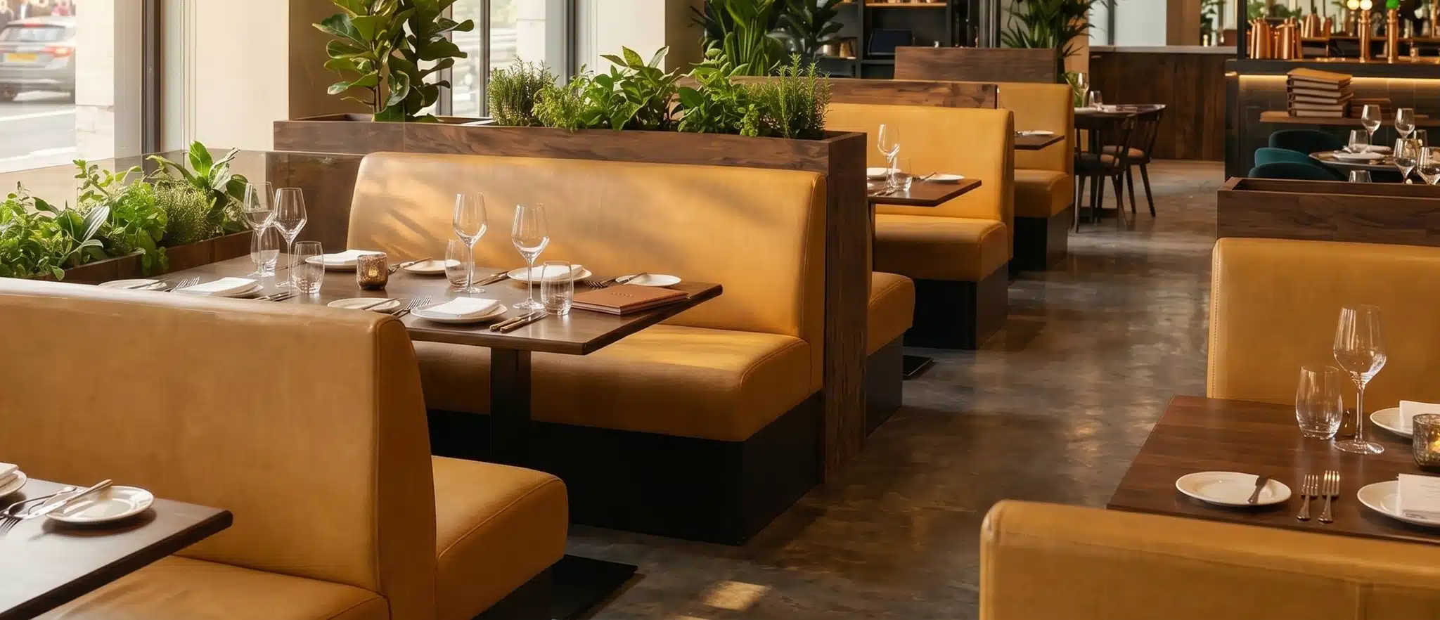 Banquette seating is designed to maximise floor space by running along walls, corners or central layouts. Compared to loose furniture, it allows for tighter, more efficient table spacing while maintaining comfort. Careful planning of seat depth, back height and walkway spacing helps increase covers without compromising service flow.