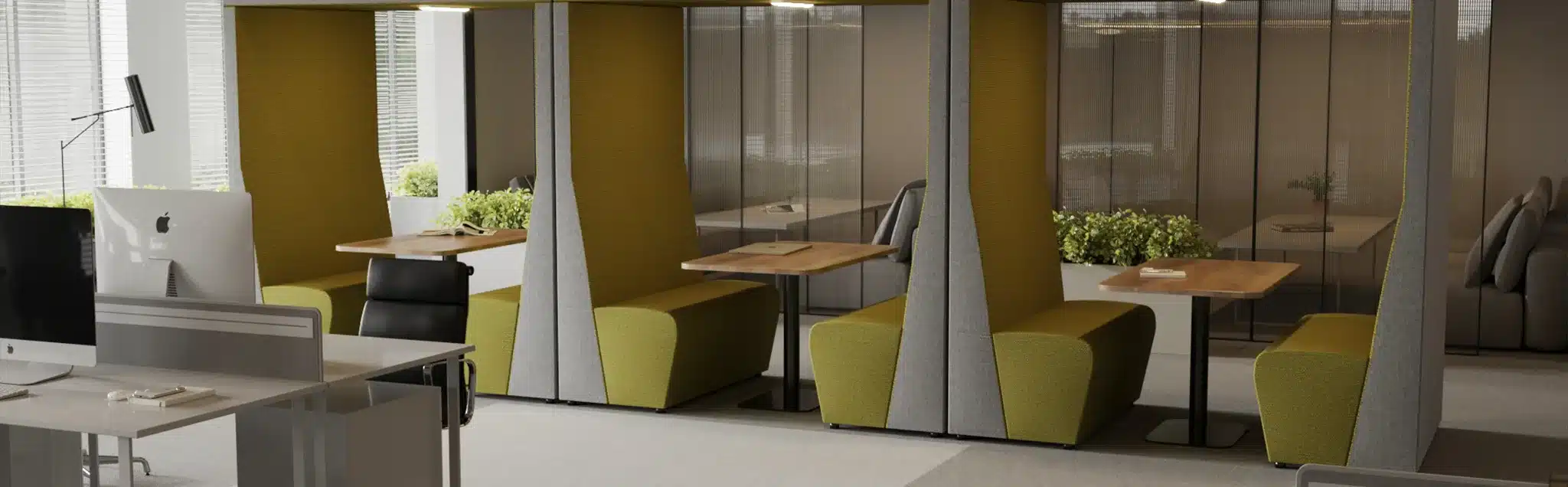 Enclosed pods aren’t always necessary. In many schemes it’s more useful to create semi-open acoustic booths that moderate sound and sightlines while keeping a visual connection to the wider floor.